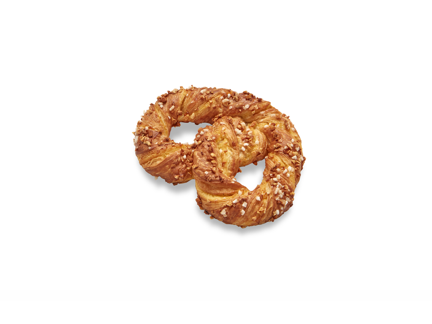 Bretzel dulce relleno de crema pastelera y cubierto de almendras.